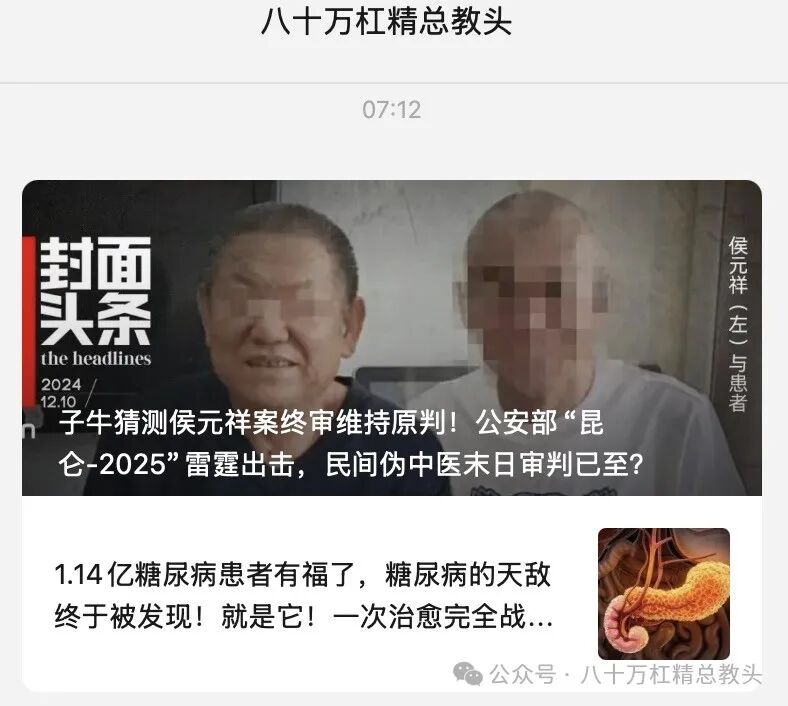 同一时刻据微信公众号“卫先生2024”消息,在千里之外的青岛,2025年5月13日青岛市中级人民法院的法槌重重落下,持续三年的侯元祥伪中医犯罪集团终审维持原判,这场以”祖传秘方”为名的血色闹剧终于迎来终章,也再一次印证了子牛依据昨日文章分析的内容推断的判决结果非常准确。