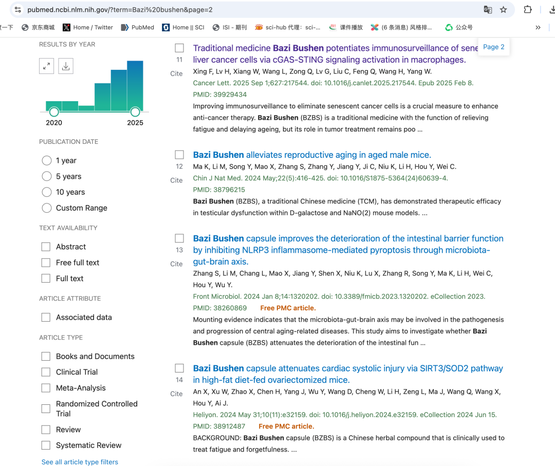 参考文献 :[1] Jia C, Wei C, Li M, et al. Bazi Bushen capsule attenuates cognitive deficits by inhibiting microglia activation and cellular senescence[J]. Pharmaceutical Biology, 2022, 60(1): 2025-2039. [2] Xing F, Lv H, Xiang W, et al. Traditional medicine Bazi Bushen potentiates immunosurveillance of senescent liver cancer cells via cGAS-STING signaling activation in macrophages[J]. Cancer Letters, 2025, 490: 217544. [3] Huang D, Wang X, Zhu Y, et al. Bazi Bushen Capsule Alleviates Post-Menopausal Atherosclerosis via GPER1-Dependent Anti-Inflammatory and Anti-Apoptotic Effects[J]. Frontiers in Pharmacology, 2021, 12: 658998. [4] Xu Z, Man S, Gong B, et al. Bazi Bushen maintains intestinal homeostasis through inhibiting TLR4/NFκB signaling pathway and regulating gut microbiota in SAMP6 mice[J]. Journal of The Science of Food and Agriculture, 2023, 103(10): 5128-5138. [5] Xu Z, Gong B, Li Z, et al. Bazi Bushen alleviates skin senescence by orchestrating skin homeostasis in SAMP6 mice[J]. Journal of Cellular and Molecular Medicine, 2023, 27(15): 2651-2660. [6] Niu K, Chang L, Zhang R, et al. Bazi Bushen mitigates age-related muscular atrophy by alleviating cellular senescence of skeletal muscle[J]. Journal of Traditional and Complementary Medicine, 2024, 14(3): 510-521.
