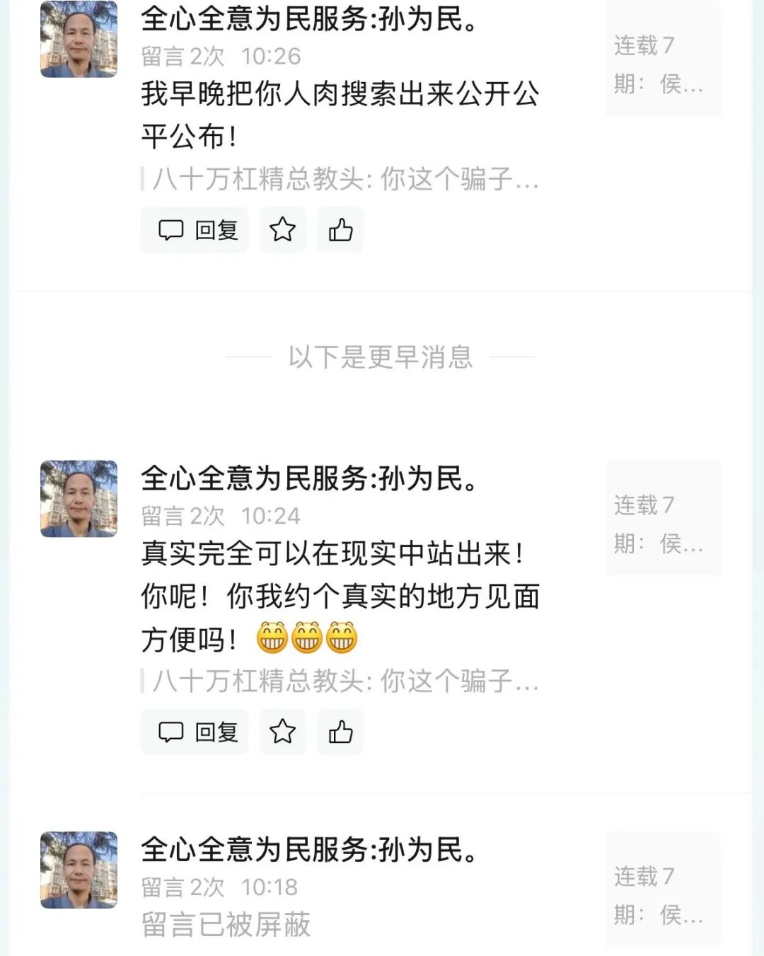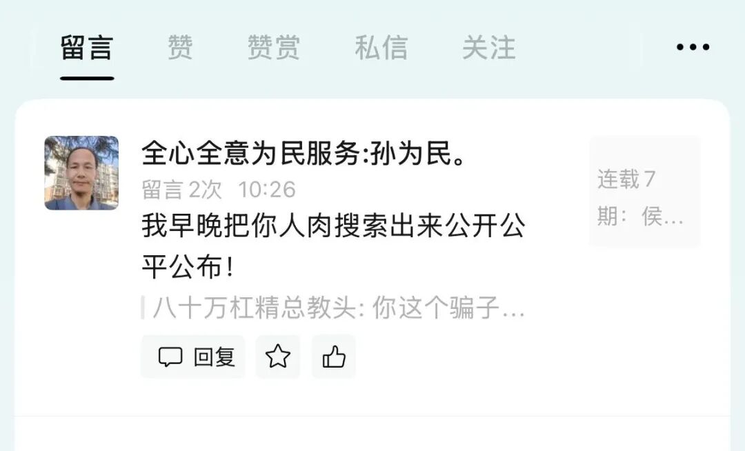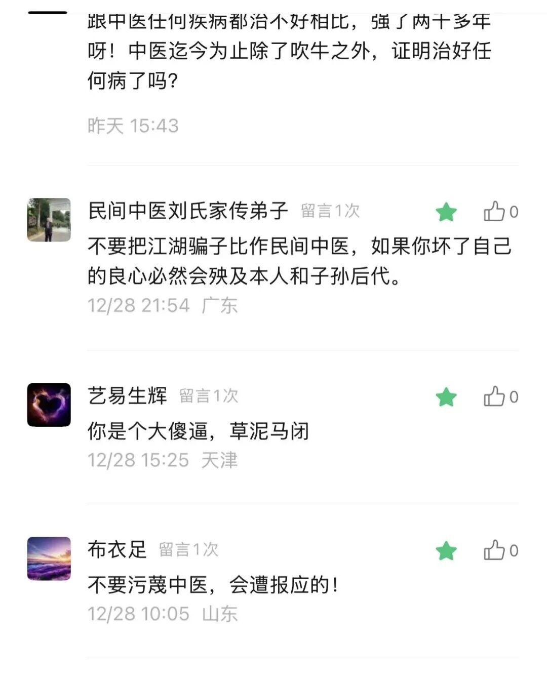 揭露假中医,被骂不算还遭“人肉”威胁,可吓死我了!哈哈哈……作者: admin / 2025年12月31日 揭露假中医,被骂不算还遭“人肉”威胁,可吓死我了!哈哈哈…… 原创 子牛plus 子牛plus 八十万杠精总教头 2025年12月31日 13:05 北京 在小说阅读器中沉浸阅读 点击上方关注我们 前两天我写了一篇文章《连载7期:侯元祥、吴鹏飞的药王谷、邬汝源、黎化雨等骗子们做的是传承千年的江湖骗术之“小贴生意”》揭露冒充中医的骗子,就是为了戳破骗局、提醒大家避坑的事,然而评论区直接炸开了锅。有人满口污言秽语骂街,还有个河北的孙为民,微信介绍写着 “专业调疑难杂症肿瘤、失眠、疼痛、三高等”,不仅脏话连篇,还扬言要人肉我,可真吓人😱 其实我心里跟明镜似的,这群人之所以跳脚骂我、甚至搞人身威胁,不是因为我 “污蔑中医”,而是我动了他们这群骗子的蛋糕。 这些所谓的 “民间中医”,压根不是正经行医的人,就是打着中医的幌子骗钱的骗子。他们瞄准的是癌症、疑难杂症患者的求生欲,把自己包装成 “神医”,靠忽悠捞取不义之财。我这篇文章把他们的遮羞布扯下来了,断了他们的骗钱路子,他们能不气急败坏吗? 还有些人,要么是被这些假中医忽悠瘸了,打心底里觉得这些骗子是 “真神医”,要么就是和骗子一伙的,自然要跳出来帮腔。他们不敢正面反驳我揭露的事实,只能用骂街、威胁这种下三滥的手段,试图让我闭嘴。 但我想说,我不怕这些威胁和辱骂。中医是跟京剧一样,都是国粹,值得被尊重和传承,可这些假中医借着中医的名头招摇撞骗,不仅坑了患者的钱,还败坏了中医的名声,这种事我见一次就要揭露一次。 也希望大家能擦亮眼睛,别被那些 “包治百病” 的假中医忽悠了,真有疾病还是要去正规医院治疗。至于那些威胁我的人,我相信法律会给出公正的结果,咱们走着瞧。 多一个点在看 多一条小鱼干 八十万杠精总教头 加入群聊 一起独立思考 图源网络 侵权删除