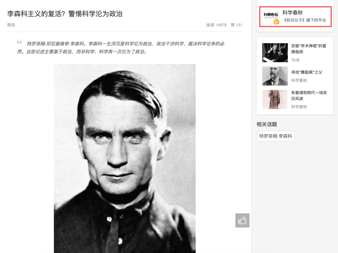警告!科学不容亵渎,生命不可儿戏!从李森科到宋代表,再到当代“神医”…(篇末可加群交流)作者: admin / 2025年12月31日 警告!科学不容亵渎,生命不可儿戏!从李森科到宋代表,再到当代“神医”…(篇末可加群交流) 原创 子牛plus 子牛plus 八十万杠精总教头 2025年12月31日 13:05 北京 在小说阅读器中沉浸阅读 点击上方关注我 + 《知识分子》旗下“科学春秋”的文章 历史总是惊人地相似,却又不会简单重复。上世纪的苏联,李森科以政治正确为外衣,用权力打压异己,将科学殿堂变成了个人秀场。他那一套“米丘林生物学”听起来多么政治正确——反对西方“反动”的遗传学,鼓吹“革命”的获得性遗传理论。可惜,科学不认权杖,只认证据。当政治浪潮退去,留下的只有苏联生物学几十年的停滞和一个永载史册的笑话。 01 当代“李森科”的相似戏码 谁能想到,几十年后,类似戏码在神州大地上竟换了演员重新上演?只不过这次舞台从“革命遗传学”换成了“民间神医”“祖传秘方”。 你看那卫柏兴(卫先生公众号,已被全禁),打着“为侯元祥喊冤、为民间中医说话”的大旗,把自己包装成正义化身。可惜掀开那层外衣,底下藏着的不过是为无资质行医张目的生意经。再看那位“大公鸡”,到处为民间骗子站台宣传,俨然成了伪科学的扩音器。最让人哭笑不得的是那位河南的中医、全国人大代表的宋代表,在央视国家应急广播的视频号镜头前表演“拍肘窝治心梗急救”,把严肃的医学急救变成了一场哗众取宠的闹剧。 此前我写的批评宋代表借助大众媒体发表的错误急救文章,遭到了他们的投诉,说我侵犯了个人隐私、肖像权,可是那是“国家应急广播”发表的视频啊,要不要也投诉他们呢? 相似的手段与逻辑 这些当代“李森科”们,手段何其相似!都是先给自己披上“为民请命”“弘扬传统”的华丽外衣,用政治正确或道德高地的铠甲武装自己。一旦有质疑之声,便立即祭出“打压民间智慧”“不尊重传统文化”等大帽子,一如当年李森科将学术争论上升为政治斗争。 他们的逻辑简单粗暴,他们不是在推销伪科学,是在“挑战西方医学霸权”;我不是在传播虚假信息,我是在“弘扬中华传统文化”;我不是在误导公众,我是在“为底层人民发声”。多好听啊!多政治正确啊!可惜,无论外衣多么华丽,皇帝终究没穿衣服。 02 罔顾科学还要多少生命代价? 科学有自己的规律,疾病不会因为你说得好听就绕道走。心梗患者若真信了“拍肘窝急救”,耽误的可是抢救的黄金时间。很多癌症患者听信了吴鹏飞“治癌症如同治感冒、治愈率80%的谎言”,放弃规范治疗去追求“祖传秘方”,付出的可能是生命的代价。这些“李森科”们赚得了流量、收获了信徒,甚至捞到了真金白银,但被他们误导的普通百姓,失去的却是健康乃至生命。 03 历史的审判带给你们的警示 历史的审判从不缺席。李森科当年何等风光,苏联科学院院长、列宁奖章获得者,权势滔天。可后来呢?赫鲁晓夫下台后,他的理论被彻底抛弃,他的名字成了科学史上最著名的负面教材之一,真正的遗臭万年。 今天的“李森科”们,你们以为自己的结局会不同吗?在信息如此透明的时代,在科学素养日益提高的公众面前,你们的把戏能玩多久?等到潮水退去,裸泳者的尴尬将比李森科更加难堪,毕竟你们连“学术外衣”都没有,只剩下一地鸡毛和无数被耽误的患者。 04 希望你们悬崖勒马 悬崖勒马吧!现在还为时不晚。真正的传统医学精华需要科学验证和创新发展,不是靠夸大宣传和表演作秀。真正的为民请命应该促进医疗规范和提高医疗可及性,而不是为无证行医开脱。真正的弘扬文化应该去芜存菁,而非将糟粕包装成瑰宝。 否则,当历史的潮水退去,你们的名字将和李森科一起,被牢牢钉在耻辱柱上,刻上的原因不是“斗士”或“传人”,而是科学的亵渎者、公众健康的背叛者、时代的笑柄。 科学不容亵渎,生命不容儿戏。这不仅是历史的教训,也是对当代每一位“李森科”们最诚恳的忠告。回头是岸,晚节可保;执迷不悟,万劫不复。选择在你们手中,但时间,已经不多了。 多一个点在看 多一条小鱼干 八十万杠精总教头 加入群聊 一起独立思考 图源网络 侵权删除