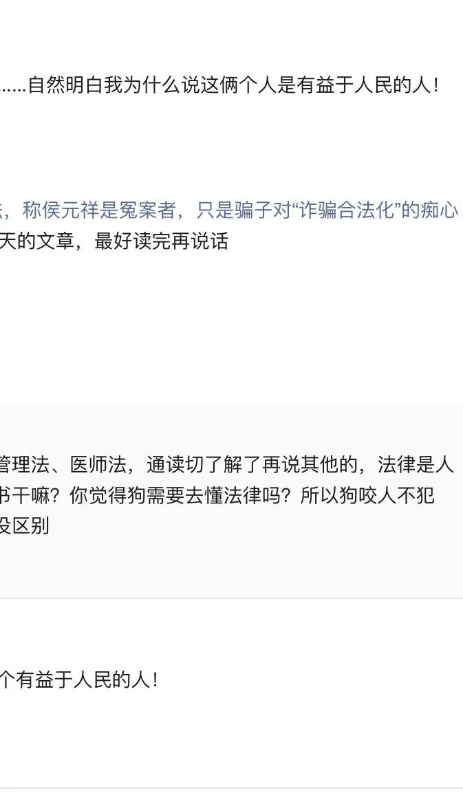 罗翔老师之前就掰扯过:狗咬人不算“违法”,因为狗没学过法,不懂啥叫规则,它的行为全是本能,压根没有法律上的主观恶意;但人不一样,人有脑子、懂对错,法律就是给人划的最低底线,突破这个底线故意作恶,那可比狗咬人恶劣多了。说白了,侯元祥、吴鹏飞、邬汝源、黎化雨以及一切非法行医制售假药的人,都是明知故犯的货,都不如狗。